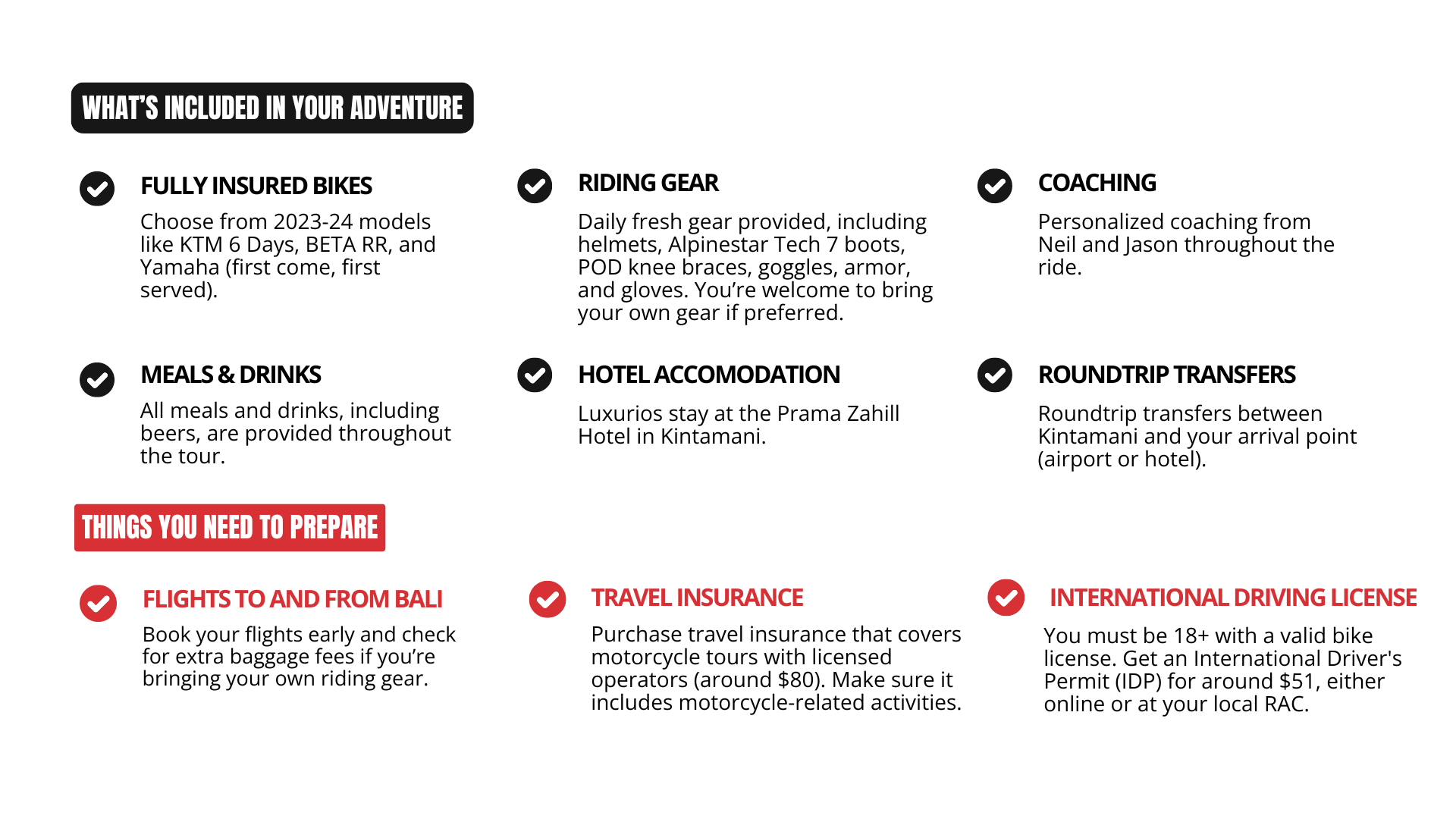 IMAGINE THIS each morning, you pick up your fresh set of riding gear and jump on your fully prepped bike. Then head out for a day of ripping through jungles, crossing rivers, climbing hills, and cruising along pristine beaches. After an EPIC ride through the back country of Kintamani, you finish back at the hotel. Just drop your bike and gear with the team and jump straight into the pool. Grab an ice-cold drink, have a laugh, talk up your riding and just RELAX. Be a factory rider, with all the fun but none of the hassle!